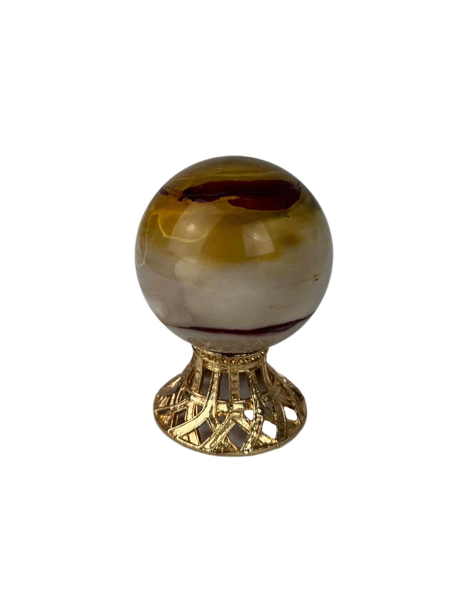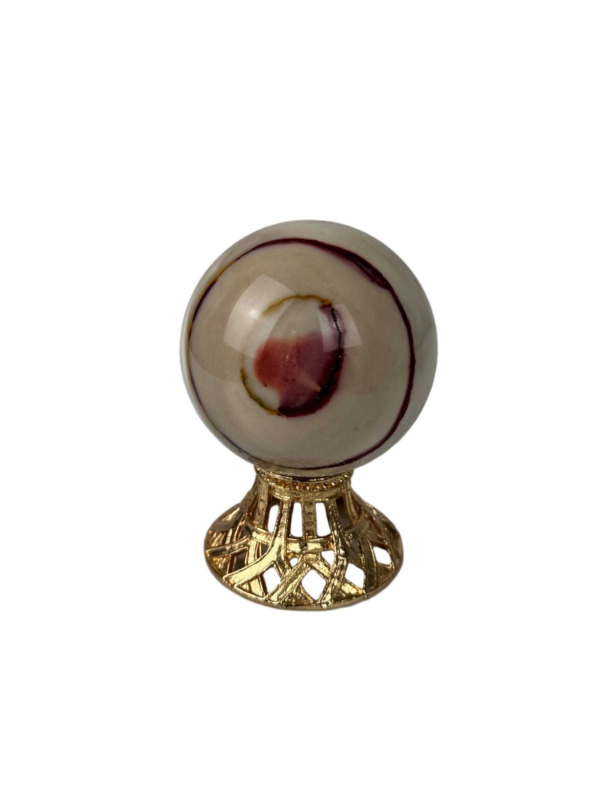 This Mookaite sphere from Australia showcases the natural beauty and intricate patterns characteristic of this unique jasper variety. Expertly polished to a smooth finish, each sphere reveals distinctive markings and variations that make every piece one of a kind. Its rounded form and natural lustre make it a striking addition to any mineral collection or decorative setting.