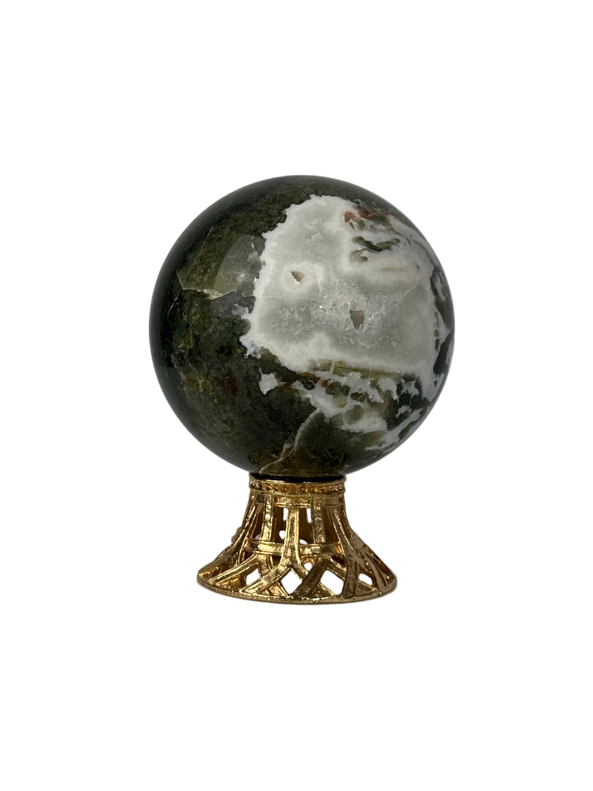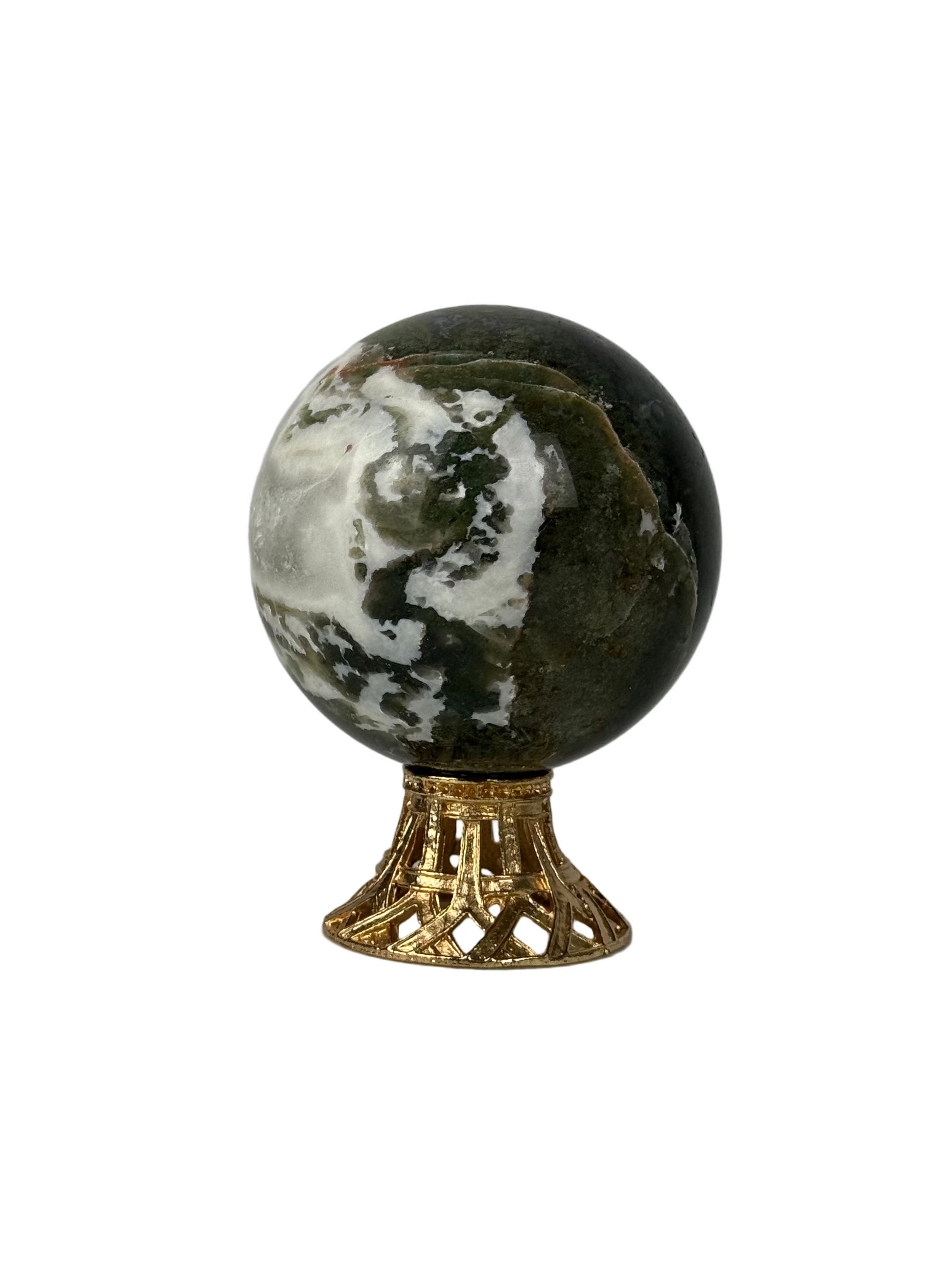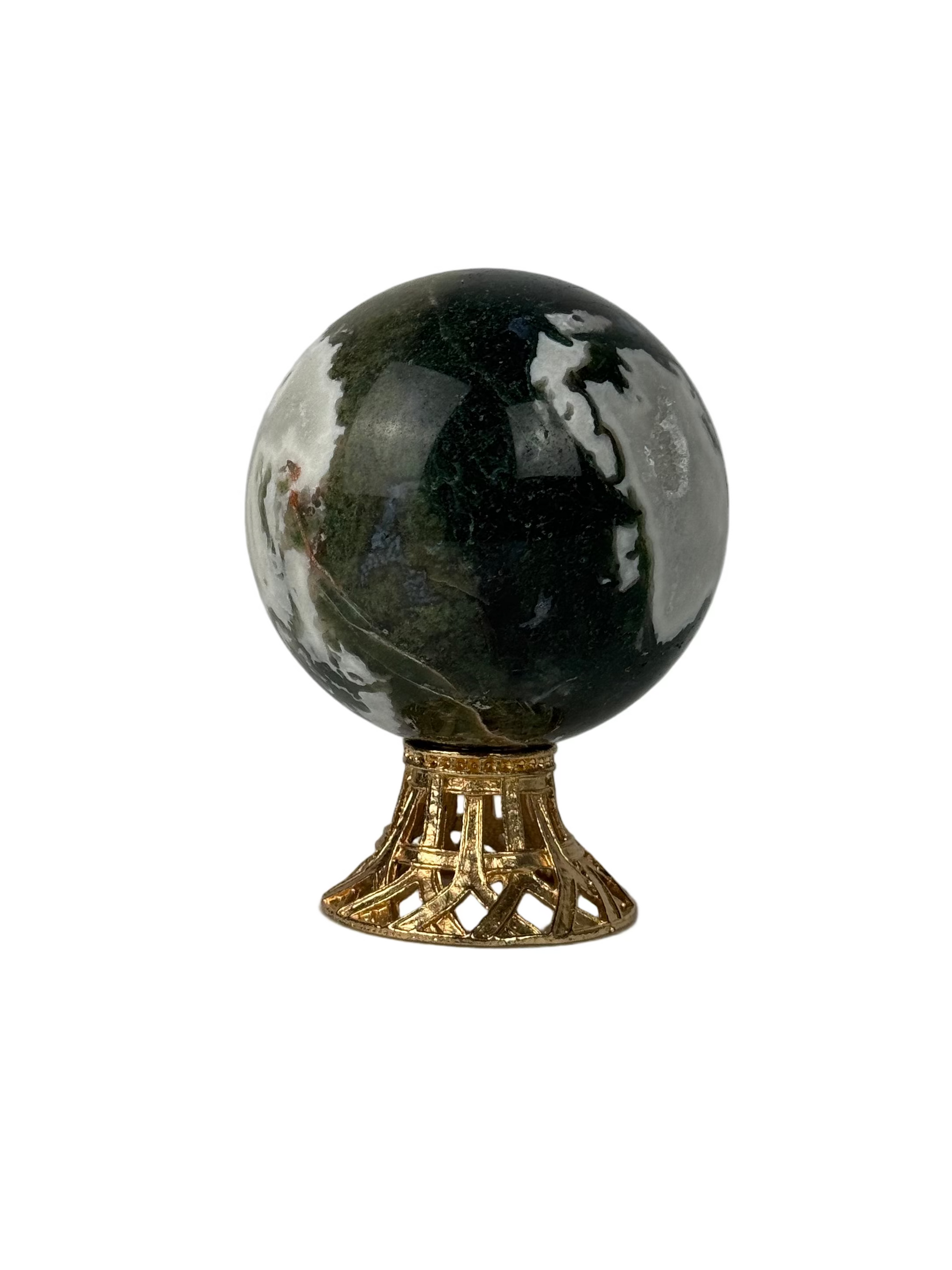 This beautiful moss agate sphere from India showcases natural green inclusions that resemble delicate moss-like patterns suspended within the stone. Its smooth, polished surface highlights the stone’s organic beauty, with varying shades of green, white, and translucent quartz creating a truly one-of-a-kind appearance. Each sphere is unique, reflecting the intricate natural formations that make moss agate so captivating.