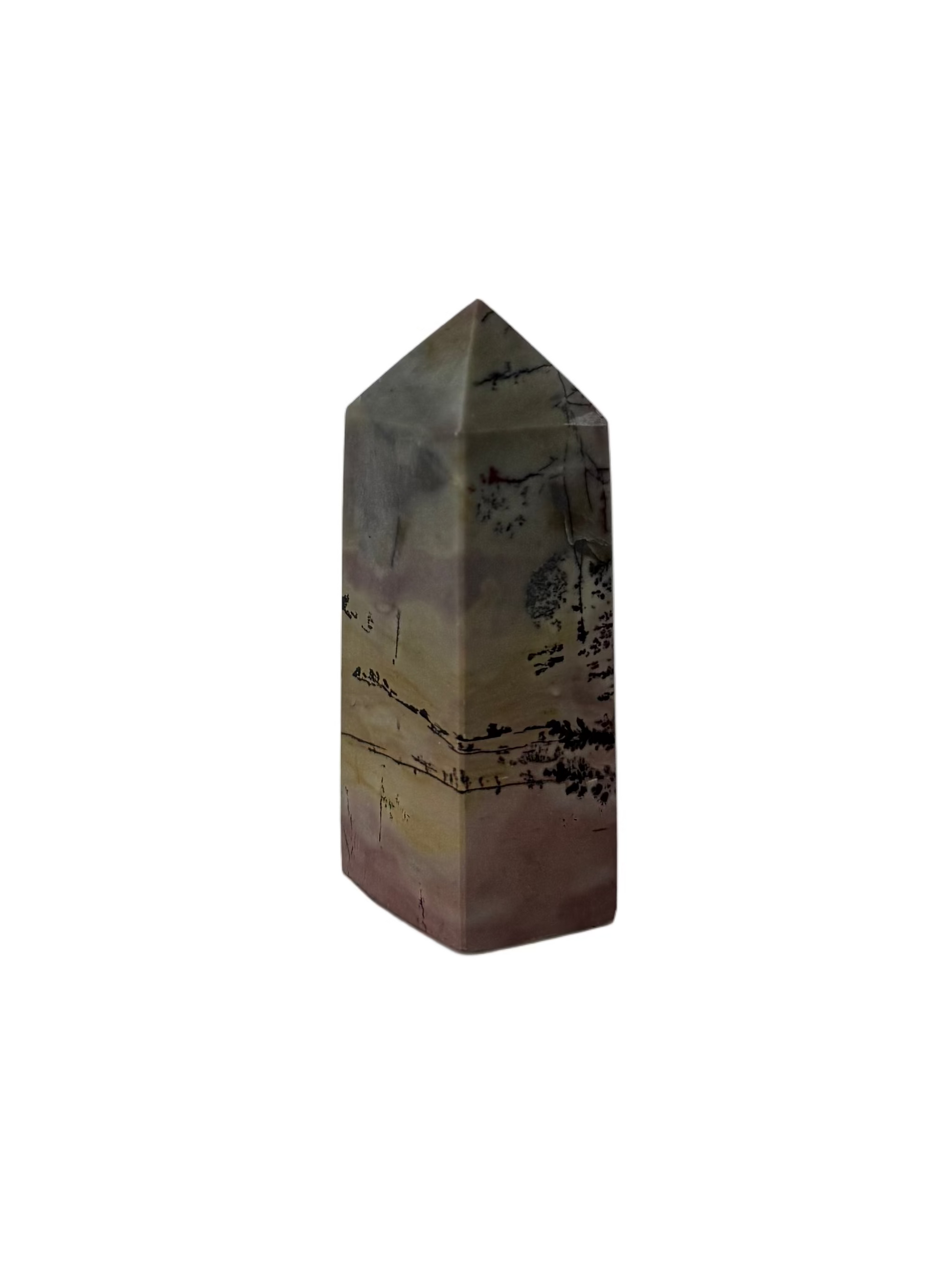 This picture jasper tower from Madagascar displays intricate natural patterns formed by dendritic inclusions, giving each piece a distinctive and organic appearance. The smooth, polished finish and elegant tower shape make it a beautiful addition to any crystal collection or decorative display. Each tower is completely unique, showcasing the fascinating natural formations characteristic of picture jasper.