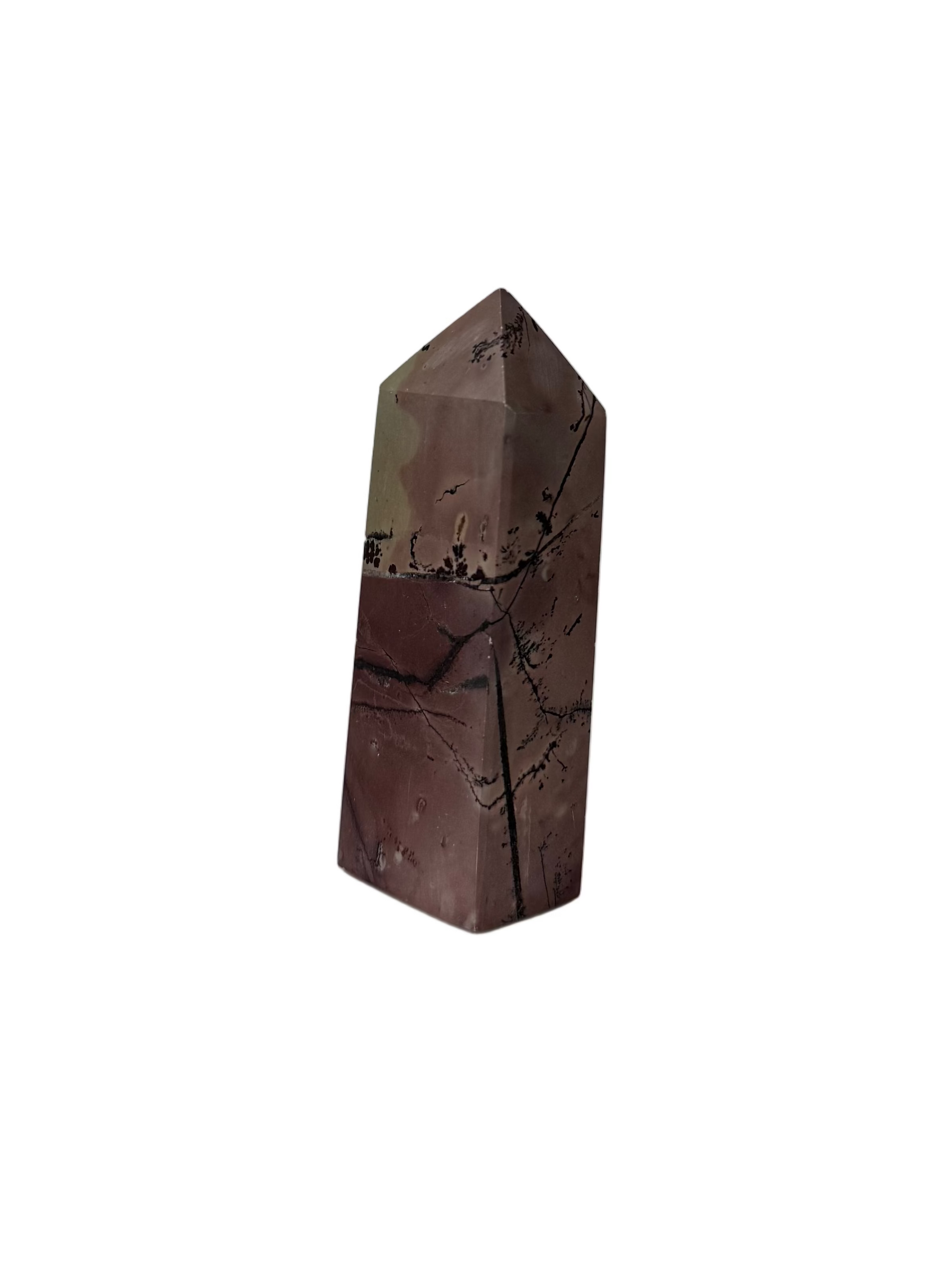 This picture jasper tower from Madagascar displays intricate natural patterns formed by dendritic inclusions, giving each piece a distinctive and organic appearance. The smooth, polished finish and elegant tower shape make it a beautiful addition to any crystal collection or decorative display. Each tower is completely unique, showcasing the fascinating natural formations characteristic of picture jasper.