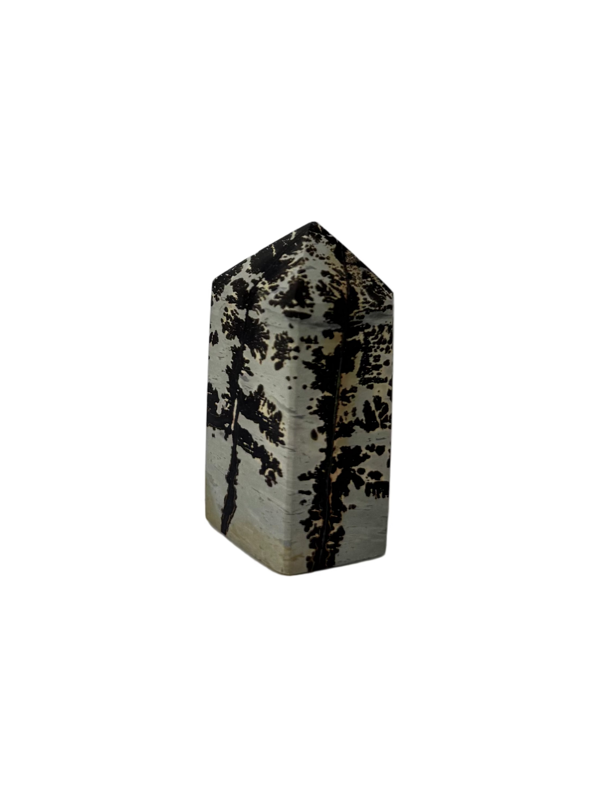 This dendritic picture jasper tower from Madagascar displays intricate natural patterns formed by dendritic inclusions, giving each piece a distinctive and organic appearance. The smooth, polished finish and elegant tower shape make it a beautiful addition to any crystal collection or decorative display. Each tower is completely unique, showcasing the fascinating natural formations characteristic of picture jasper.