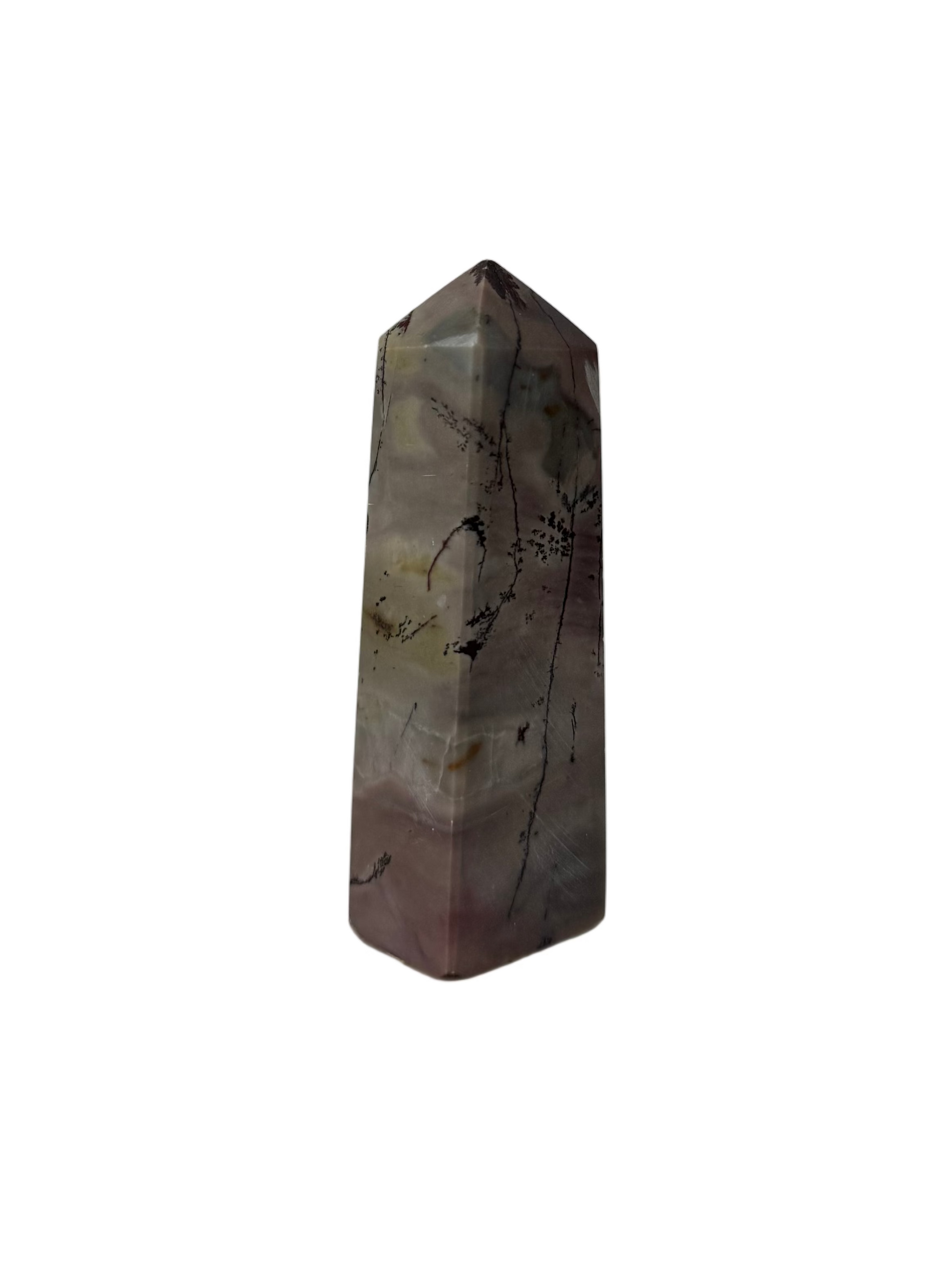 This picture jasper tower from Madagascar displays intricate natural patterns formed by dendritic inclusions, giving each piece a distinctive and organic appearance. The smooth, polished finish and elegant tower shape make it a beautiful addition to any crystal collection or decorative display. Each tower is completely unique, showcasing the fascinating natural formations characteristic of picture jasper.