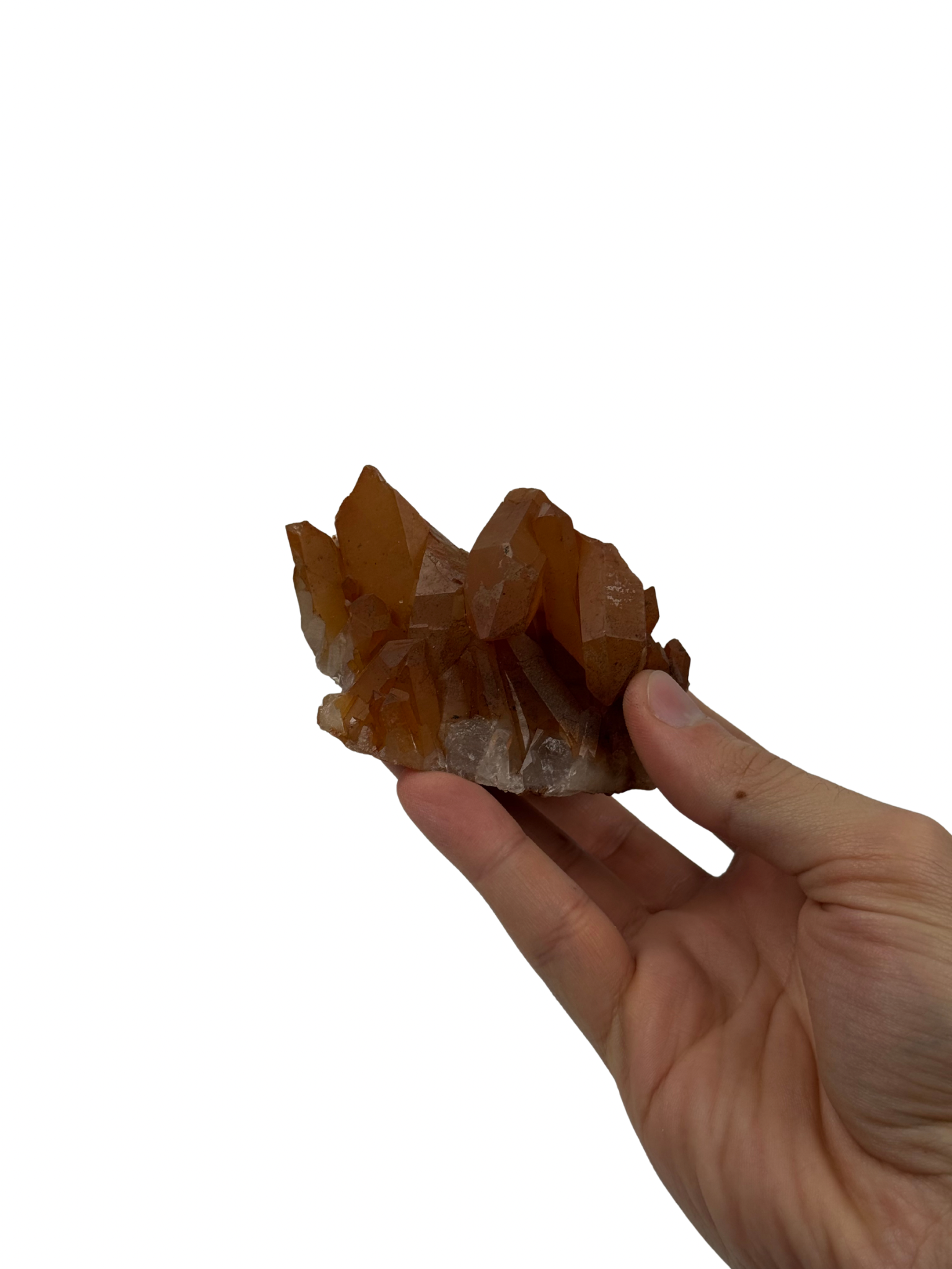 This tangerine quartz specimen from Brazil features natural crystal formations with a distinctive surface coating that gives the quartz its characteristic appearance. Each piece displays unique growth patterns and textures, making it an interesting and visually appealing addition to any mineral collection or decorative display.